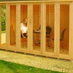 Featuring a fantastic 10 year anti-rot guarantee the front elevation has four leaf bi-fold doors, enabling it to open fully, providing shelter from sun and showers whilst enjoying the garden. Further light fills the space from the two fixed side windows. All glazing is plastic ensuring protection from broken glass hazards for added peace of mind.