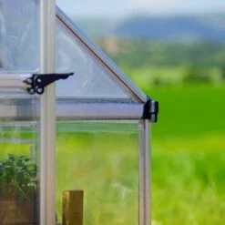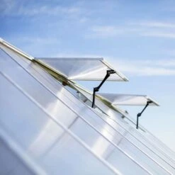 Supported by a silver aluminium frame, for added strength and an extra-rigid structure, this 10×12 greenhouse uses both light-diffusing 4mm twin-wall polycarbonate roof panels and crystal-clear polycarbonate side panels, the latter of which provide 90% light transmission. Both types of polycarbonate panel are completely UV-protected.