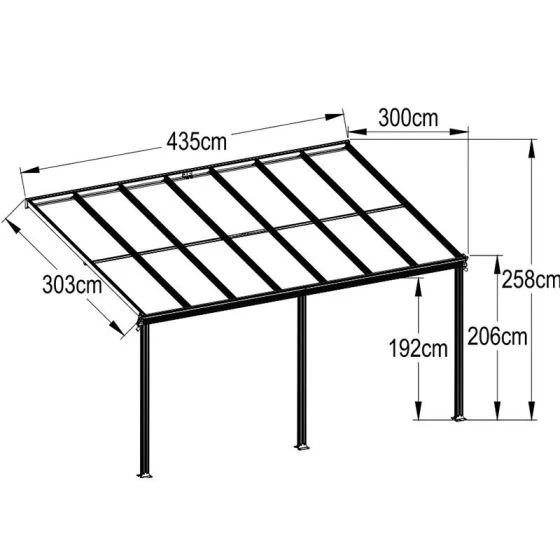 This stylish patio cover is available in a range of sizes. Please note that it must be installed on a solid, level surface and with solid wall support.