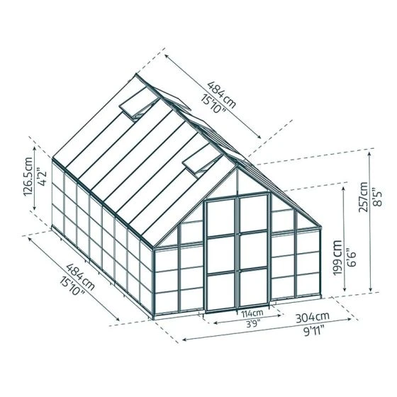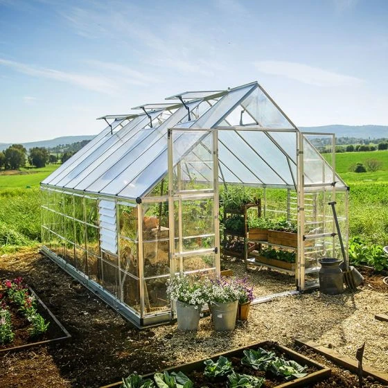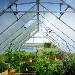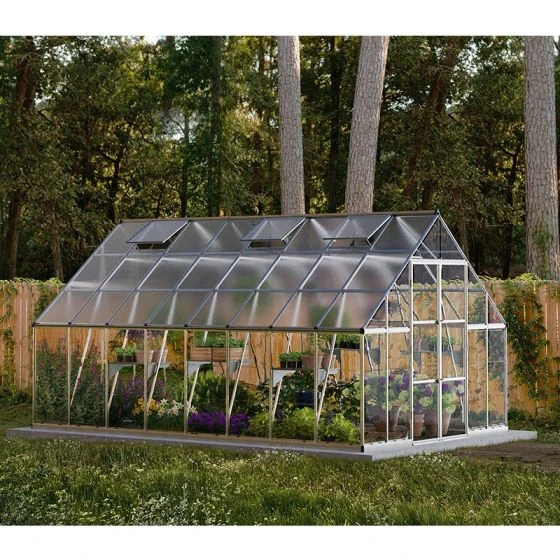 Supported by a silver aluminium frame, for added strength and an extra-rigid structure, this 10×16 greenhouse uses both light-diffusing 4mm twin-wall polycarbonate roof panels and crystal-clear polycarbonate side panels, the latter of which provide 90% light transmission. Both types of polycarbonate panel are completely UV-protected.
