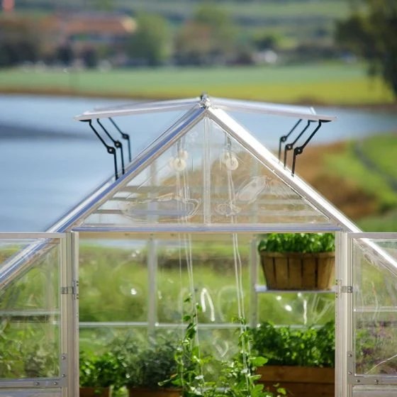The roof panels promote an even temperature by increasing thermal insulation and reducing extreme sunlight exposure, so plants enjoy perfect growing conditions, the gardener remains safe from harmful UV-rays, and the panels neither discolour nor fade in the sun. The roof’s apex style gives this greenhouse a traditional feel and ensures highly effective rainwater runoff.