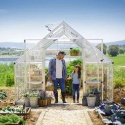 Supplied with a reassuring 5-year limited warranty and completely maintenance free, this premium greenhouse’s high-impact polycarbonate panels are pre-cut with uniform profiles, allowing them to be slid into place for an incredibly easy assembly. Designed without a floor, this greenhouse should be secured to a solid, level base.