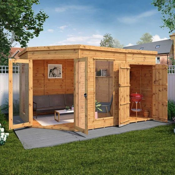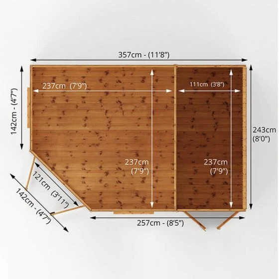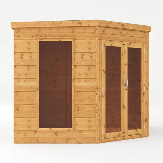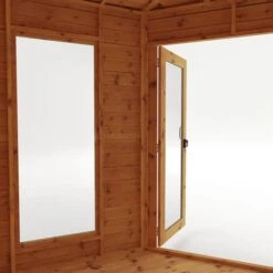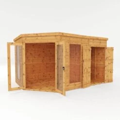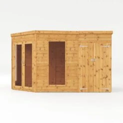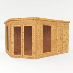 With its unusual pentagonal design, extensive glazing and top-quality build, the 12′ x 8′ Mercia Premium Corner Summer House with Side Shed (3.6m x 2.6m) is the perfect fit to turn an unused corner of the garden into both a place to relax and keep tools safe.