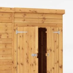 The side shed has its own set of double doors, which provide storage-friendly access and are fitted with a pad bolt to keep tools secure (padlock not included). This shed contains ample storage space for a lawnmower, bike and variety of tools.