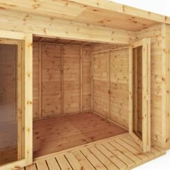 Access to the summerhouse is gained via a veranda and through beautiful bi-fold double doors, which feature floor to ceiling glazing, handles, hinges and a key-operated lock. Together with the large side window, these doors provide the interior with an abundance of natural light. All of the glazing is made from shatterproof styrene, which is far tougher and safer than conventional glass.