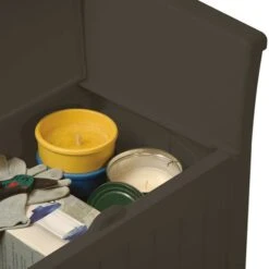 The dual-purpose 2’7 x 1’9 Suncast 117 Litre Plastic Garden Storage Seat in Java Brown offers small outside storage underneath comfortable seating, providing a great way to maximise garden space.