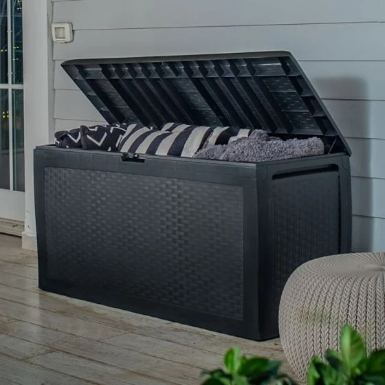 This patio storage box is constructed from tough resin, so is strong, long-lasting and water resistant. With a rattan-effect design and completely UV protected, this outdoor storage box will maintain its attractive appearance and neither discolour nor fade in the sun. A wipe down with a damp cloth is the only maintenance required.