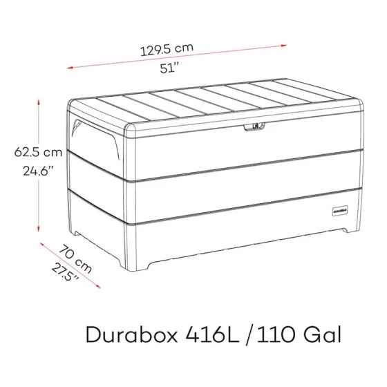 Ideal for cushions, kids’ toys, tools and more, the 4’3 x 2’4 Saffron Durabox 416L Plastic Garden Storage Box (1.3m x 0.7m) is stylishly designed and comes with an excellent 10-year guarantee.