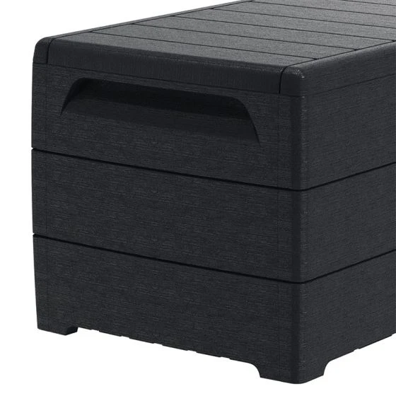 This patio storage box is constructed from high-quality plastic and features an attractive woodgrain-effect finish. Strong, stylish and weathertight, it will neither rust, rot nor develop mildew, and is completely maintenance free.