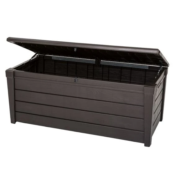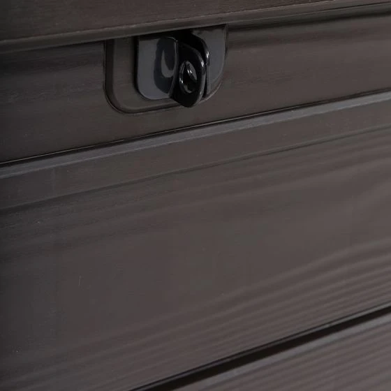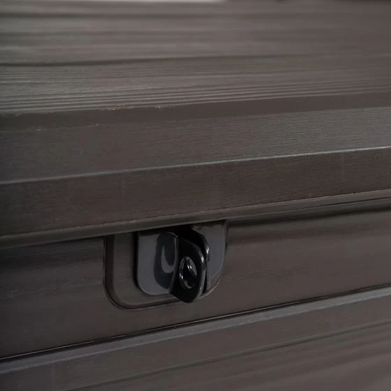 This outdoor storage box is constructed from tough resin, with an attractive wood-effect finish. It is completely weatherproof and UV protected, so will maintain its stylish appearance for many years to come, and neither discolour nor fade in the sun.