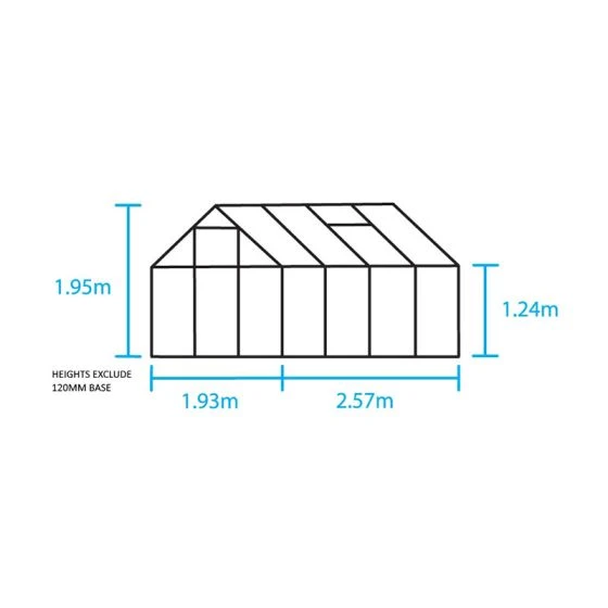 All our Halls Popular Greenhouses are 1.93m wide with a 1.22m eaves height and a ridge height of 1.96m. This 6×8 greenhouse is 2.57m deep with a base area of 5.0m2.