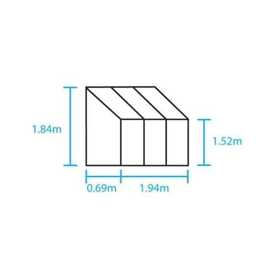 All our Halls Wall Garden Greenhouses are 0.69m deep with a generous 1.53m front height and 1.82m ridge height. This 6×2 greenhouse is 1.94m wide with a base area of 1.34m2.