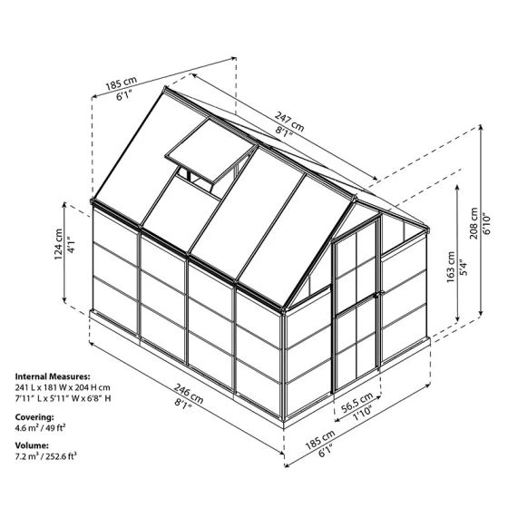 Supported by a grey aluminium frame and galvanised steel perimeter base, this 6×8 greenhouse uses both light-diffusing 4mm twin-wall polycarbonate roof panels and crystal-clear 0.7mm polycarbonate side panels, which combine to provide 82% light transmission.
