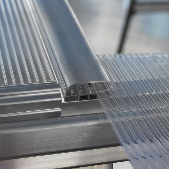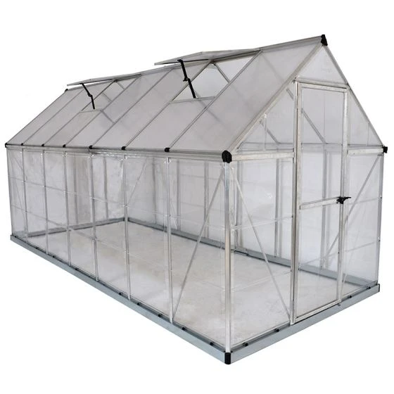 Supported by a silver aluminium frame and galvanised steel perimeter base, this 6×14 greenhouse uses both light-diffusing 4mm twin-wall polycarbonate roof panels and crystal-clear 0.7mm polycarbonate side panels, which combine to provide 82% light transmission.
