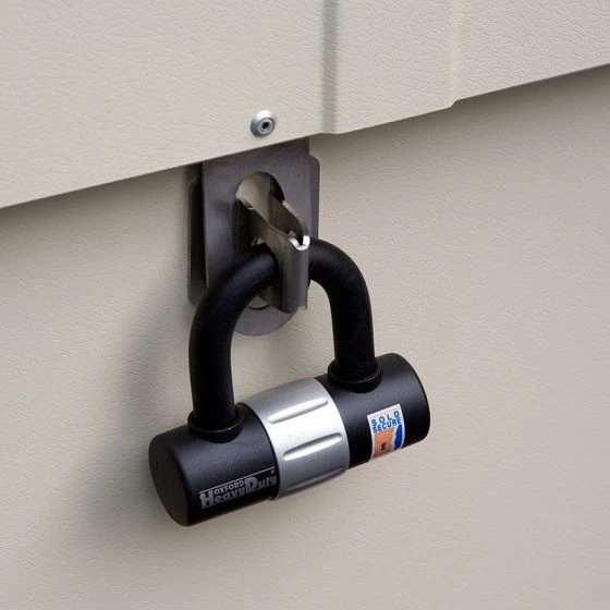 This bicycle store is unique in achieving LPCB award LPS1175 Security Rating 1 and securing the police’s Secure by Design mark. The 2 stainless steel hasps and high security padlocks (Sold Secure silver approved) provide excellent security on the outside of the store, whilst on the inside, a heavy-duty ground anchor (again Sold Secure silver approved) complete with high security cable (Loss Prevention Board tested) will stop even the most determined thief. Protect-a-Cycle also now comes with a free alarmed cable lock, specifically designed to resist cutting.