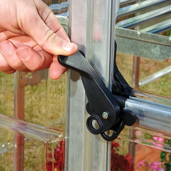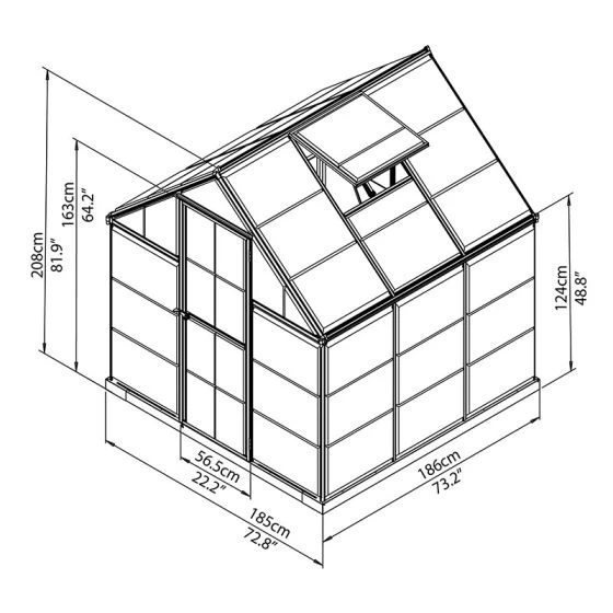 Expertly constructed from 0.7mm polycarbonate panels, supported by a silver aluminium frame and galvanised steel perimeter base, this 6×6 greenhouse is shatterproof, fracture-proof and completely resistant to rust. Wind resistant to 90km/ hr (56ml/ hr) and snow-load tested to 75kg/ m² (15.4lbs/ ft²) too, it provides both plants and garden equipment with outstanding weatherproof protection.
