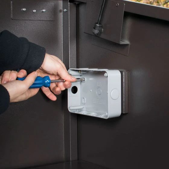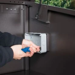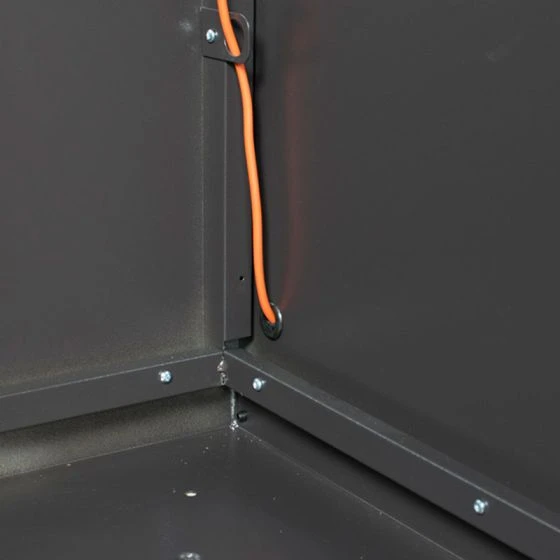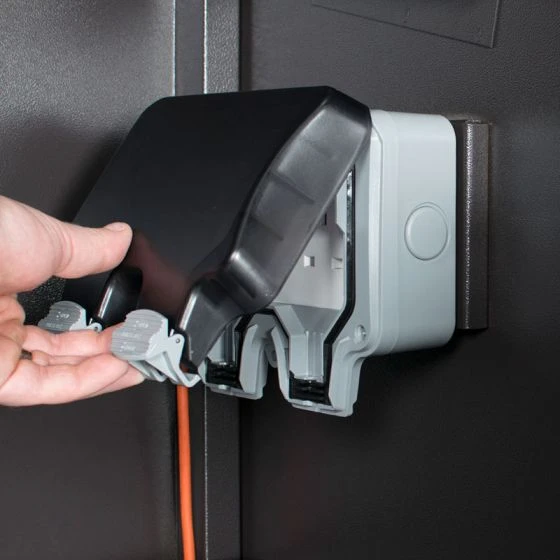 Each side of the unit includes a mounting plate for electric sockets (sockets not included) and convenient access holes with rubber grommets, which allow cables to be fed into the bike store so that the bicycles can be charged whilst the unit is locked.