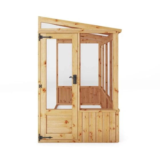 The 84 Lean-To Wooden Greenhouse is formed from 12mm tongue and groove softwood cladding upon a 45 x 27mm framework. All glazing throughout is safety Styrene and the roof is supplied with one opening roof vent.