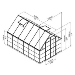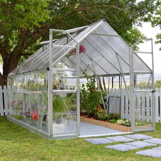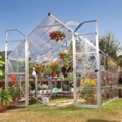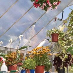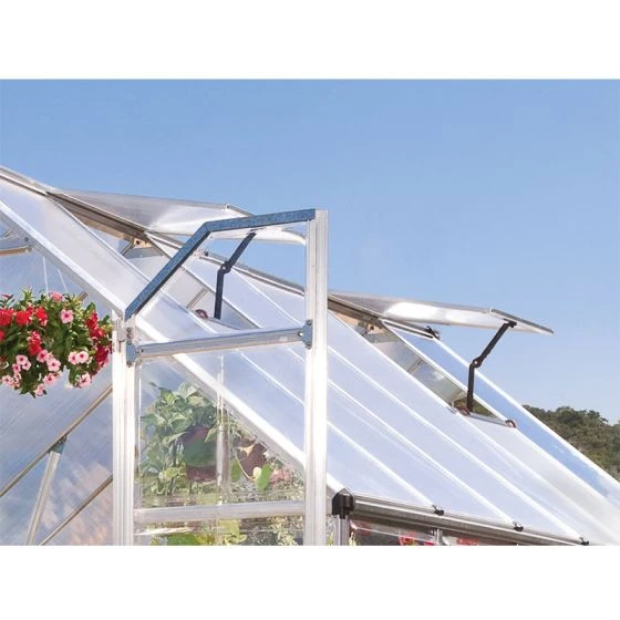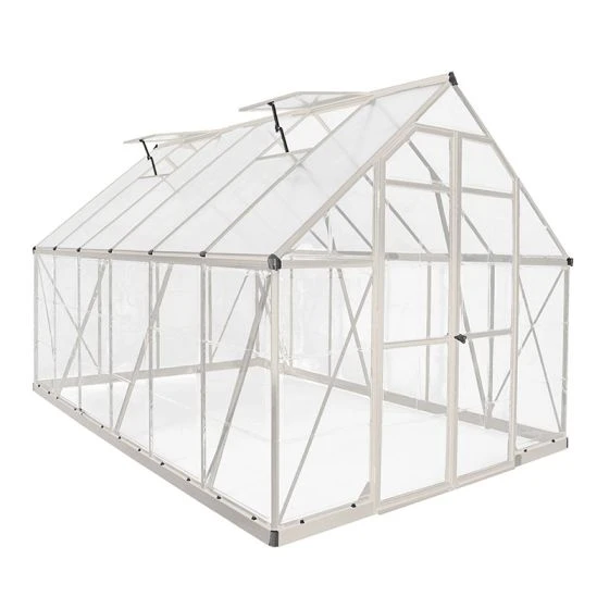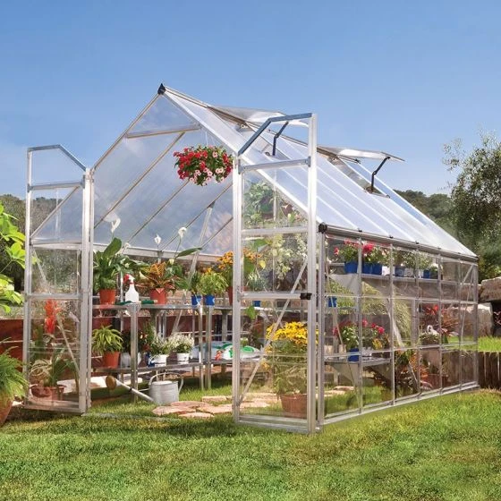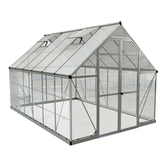 Supported by a silver aluminium frame and extra support beams, for added strength and an extra-rigid structure, this 8×12 greenhouse uses both light-diffusing 4mm twin-wall polycarbonate roof panels and crystal-clear 0.7mm polycarbonate side panels, which together provide 82% light transmission.
