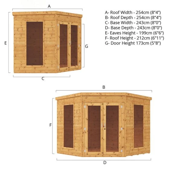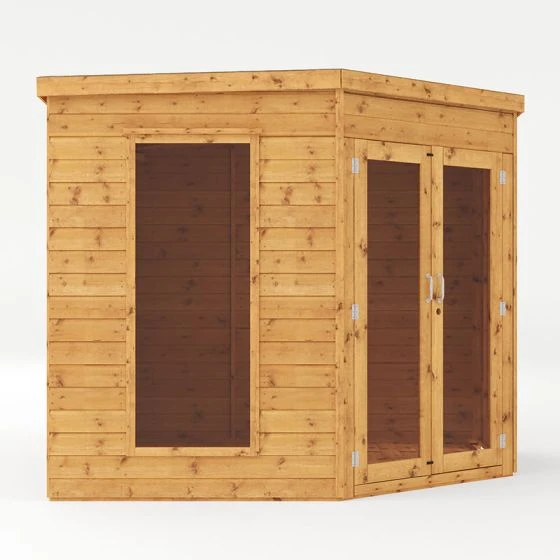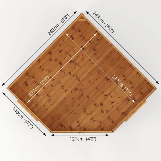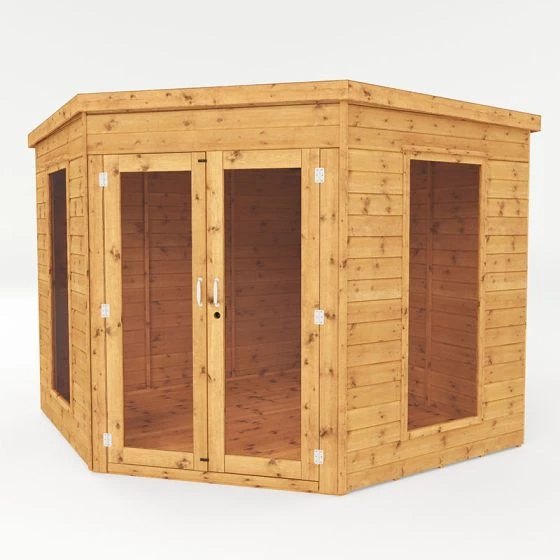 This 8×8 Mercia Premier Corner Summerhouse is designed to fit into a corner of your garden taking up lost space and offers an attractive feature to any garden. Constructed from extremely stable 12mm tongue and groove cladding which interlocks meaning that the exterior is weatherproof.