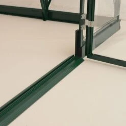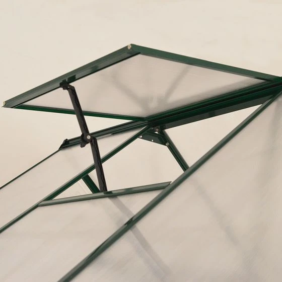 Supported by a green aluminium frame and extra support beams, for added strength and an extra-rigid structure, this 8×8 greenhouse uses both light-diffusing 4mm twin-wall polycarbonate roof panels and crystal-clear 0.7mm polycarbonate side panels, which together provide 82% light transmission.