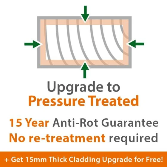 - Upgrade to pressure-treated for 15-year guarantee and FREE 15mm cladding upgrade