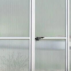 The greenhouse is expertly constructed from high-impact twin-wall polycarbonate panels (6mm for the roof and walls; 4mm for the door and vents). This is then supported by a silver aluminium frame and galvanised steel perimeter base, resulting in an 8×12 greenhouse that is is shatterproof, fracture-proof and resistant to rust. Wind resistant to 100km/ hr (62ml/ hr) and snow-load tested to 100kg/ m² (20.5lbs/ ft²) too, it provides both plants and garden equipment with outstanding weatherproof protection.