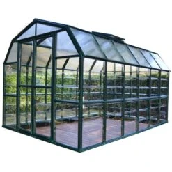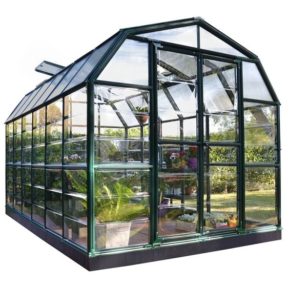 Supported by a green resin frame with pin and lock connectors, this 8×12 greenhouse combines light-diffusing 4mm twin-wall polycarbonate roof panels and crystal-clear 0.7mm polycarbonate side panels to provide 90% light transmission.