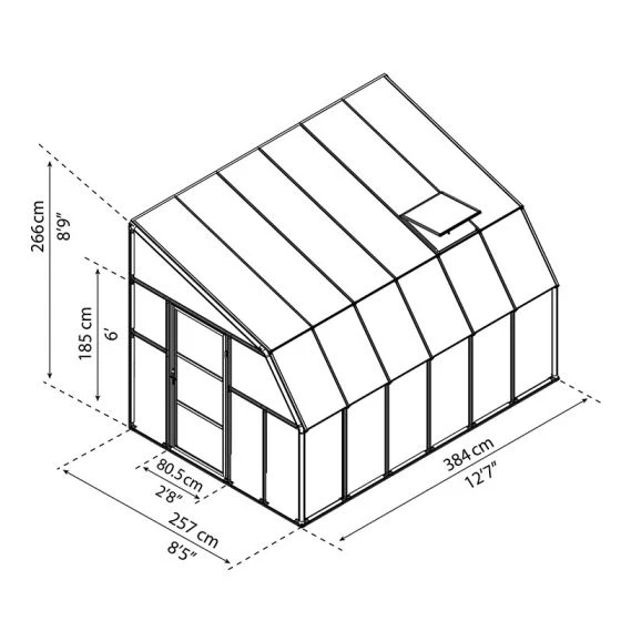 Supported by a thick, white resin frame, with its central profiles reinforced by galvanised steel rods, this 8×12 greenhouse uses both light-diffusing 4mm twin-wall polycarbonate roof panels and crystal-clear 3mm polycarbonate side panels, which combine to provide 82% light transmission.