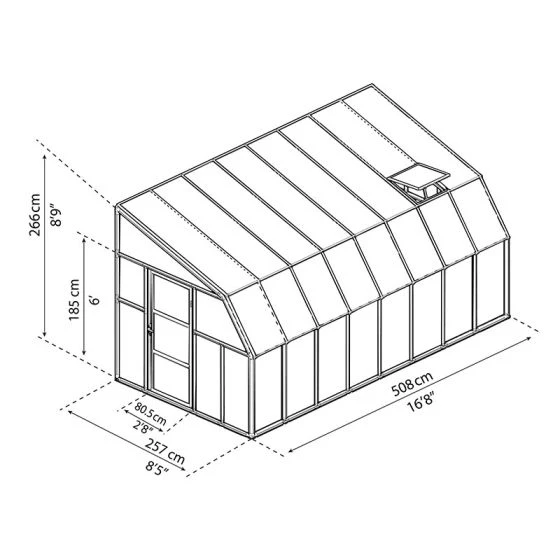 Supported by a thick, white resin frame, with its central profiles reinforced by galvanised steel rods, this 8×16 greenhouse uses both light-diffusing 4mm twin-wall polycarbonate roof panels and crystal-clear 3mm polycarbonate side panels, which combine to provide 82% light transmission.