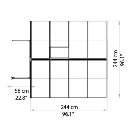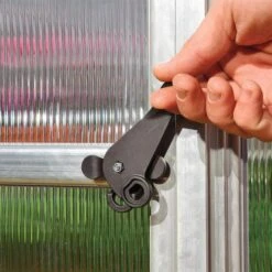 The greenhouse is expertly constructed from high-impact twin-wall polycarbonate panels (6mm for the roof and walls; 4mm for the door and vents). This is then supported by a silver aluminium frame and galvanised steel perimeter base, resulting in an 8×8 greenhouse that is is shatterproof, fracture-proof and resistant to rust. Wind resistant to 100km/ hr (62ml/ hr) and snow-load tested to 100kg/ m² (20.5lbs/ ft²) too, it provides both plants and garden equipment with outstanding weatherproof protection.