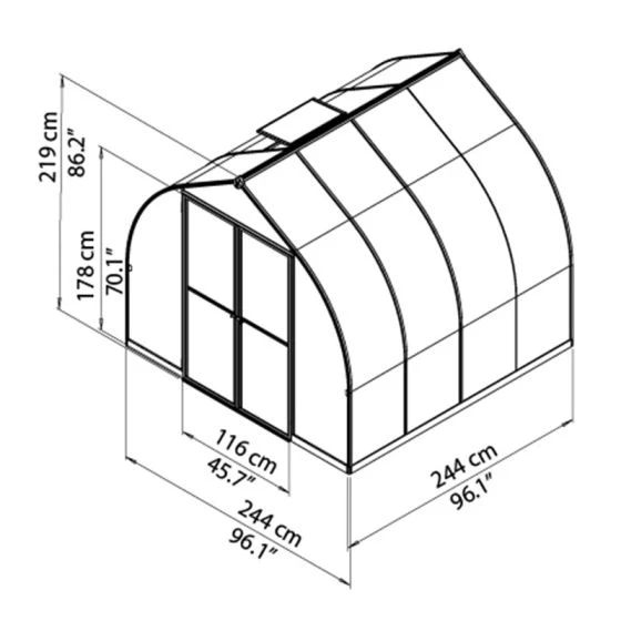 - Twin wall polycarbonate panels (6mm for the roof and walls; 4mm for the door and vents) allow 80% light transmission, block harmful UV rays and promote an even temperature