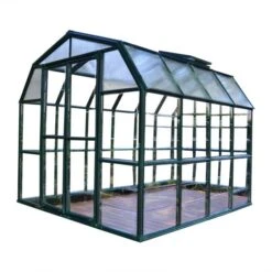 Supported by a green resin frame with pin and lock connectors, this 8×8 greenhouse combines light-diffusing 4mm twin-wall polycarbonate roof panels and crystal-clear 0.7mm polycarbonate side panels to provide 90% light transmission.