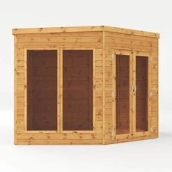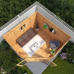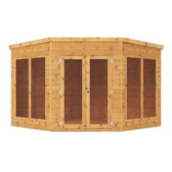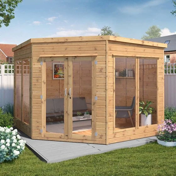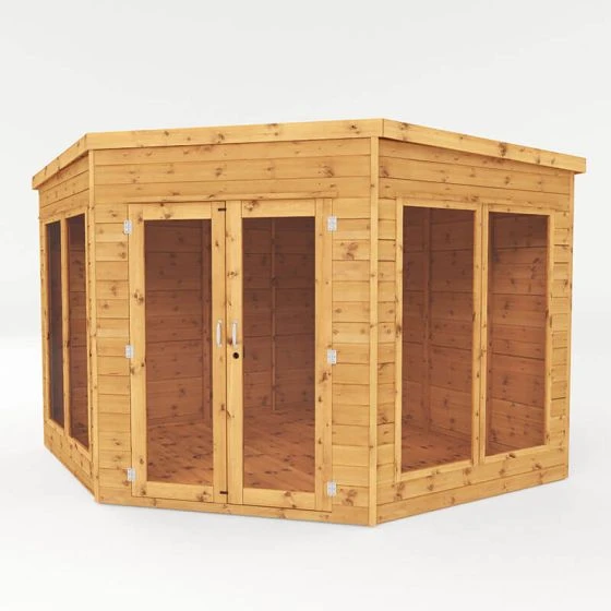 With its unusual pentagonal design, extensive glazing and top-quality build, the 9′ x 9′ Mercia Premium Corner Summer House (2.9m x 2.9m) is the perfect fit to turn an unused corner of the garden into an attractive venue for family get-togethers and alfresco dining.