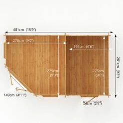 The side shed measures 9’ x 6’6, so contains ample room for all manner of tools, bikes, and outdoor equipment. It comes with its own door and is separated from the log cabin by a partitioning wall.