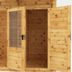 Easy access to the log cabin section of this garden building is gained via wide double doors, which are fitted with a mortice lock and key to keep valuable items safe. These doors are partially glazed too. Together with the large opening window, this means the interior enjoys plenty of natural light plus ventilation, if required. All of the glazing is styrene, which is virtually unbreakable and far safer than conventional glass.