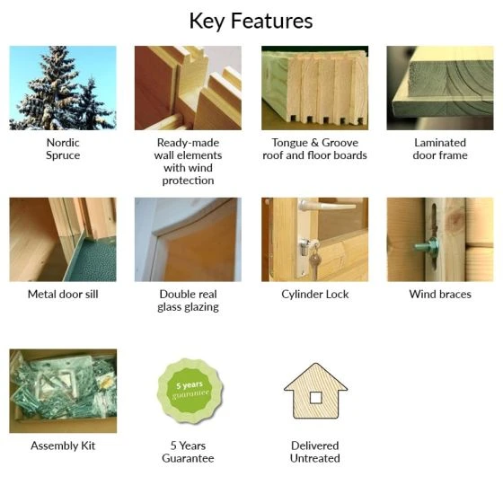 This garden cabin is supplied untreated. Apply an anti-fungal treatment upon assembly and annually, thereafter, to maintain the log cabin’s attractive appearance and validate the guarantee. Alternatively, paint can be applied for a more individual style.