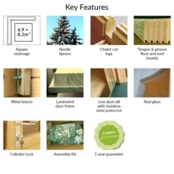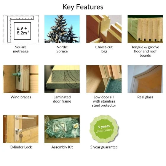 Constructed from thick 28mm Nordic Spruce interlocking logs, this is a strong and reliable garden cabin featuring an authentic chalet style build with chamfered log ends and wind braces. The apex roof and floor are constructed from 19mm tongue and groove cladding, well-known for its durability, strength and weather resistant qualities, making the whole design a long-lasting and hardwearing asset.