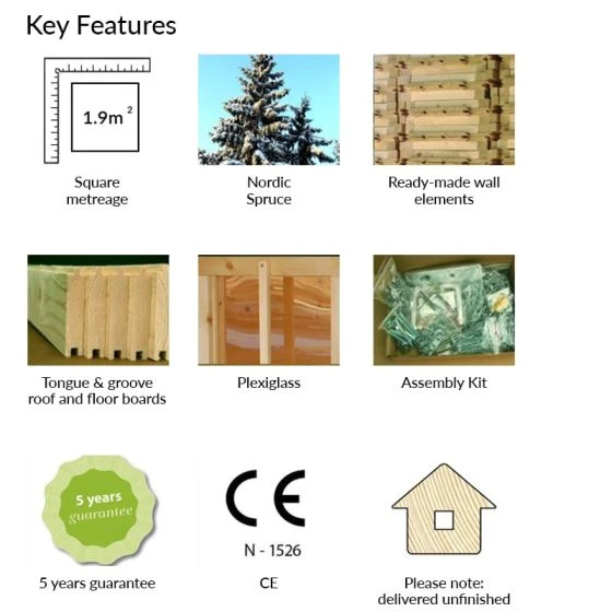 Constructed from 16mm Nordic Spruce, the tongue and groove wall cladding provides an attractive and robust build. The strong floor is constructed from 16mm tongue and groove, well-known for its weather resistance and durability, ideal for many years of use. The apex roof is 16mm tongue and groove, featuring a generous ridge height of 169cm to provide a feeling of space.