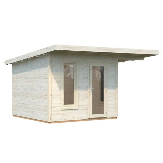 This garden room features both a traditional log cabin and a covered outdoor area. The former is manufactured from thick, laminated 56mm Nordic spruce tongue and groove boards, making it suitable for use the whole year round. The latter can be used for outside storage or as an additional living space during the summer months.