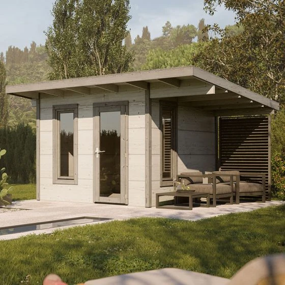 The Palmako Grace 4.5m x 3.9m Pent Log Cabin (56mm) combines a premium garden room with a sheltered outside area, making it a great garden hideaway to enjoy throughout the year.