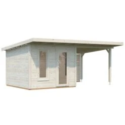 This garden room features both a traditional log cabin and a large gazebo. The former is manufactured from thick, laminated 56mm Nordic spruce tongue and groove boards, making it suitable for use the whole year round. The latter can be used for outside storage or as an additional living space during the summer months.