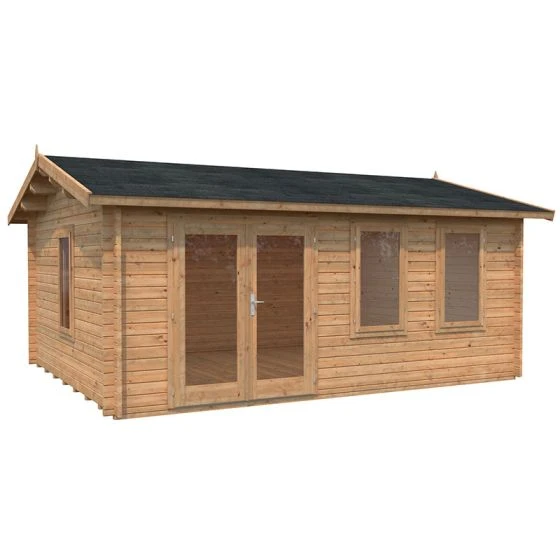 Fully-glazed, the double doors also benefit from safety glass and a laminated door frame construction. This provides resistance to the warping and cracking associated with changes in temperatures. A key-operated cylinder lock provides security while a stainless steel door sill cover protects this high traffic area. Three large opening windows provide light and ventilation to the 17×13 log cabin. The doors and windows are all double-glazed with real glass and fitted with rubber seals to eliminate draughts and improve insulation.