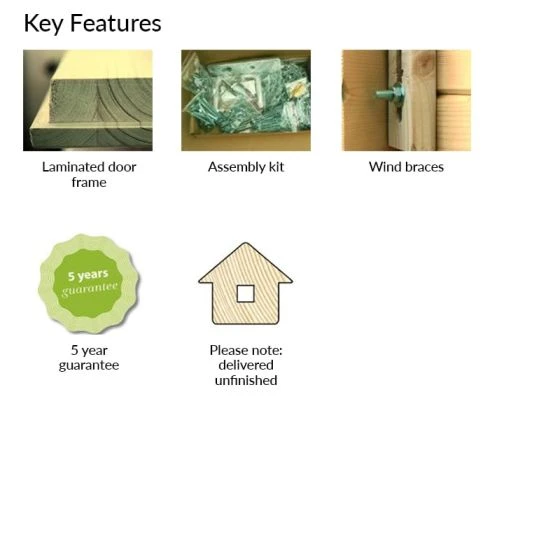 Interlocking 44mm high quality Nordic spruce logs provide a strong and durable structure. The floor and roof are both constructed from 19mm tongue and groove cladding, well-known for its weather resistance, durability and strength, providing a hardwearing and long-lasting structure for many years use in this appealing space. This superior build is further supported by wind braces and pressure treated foundation joists.