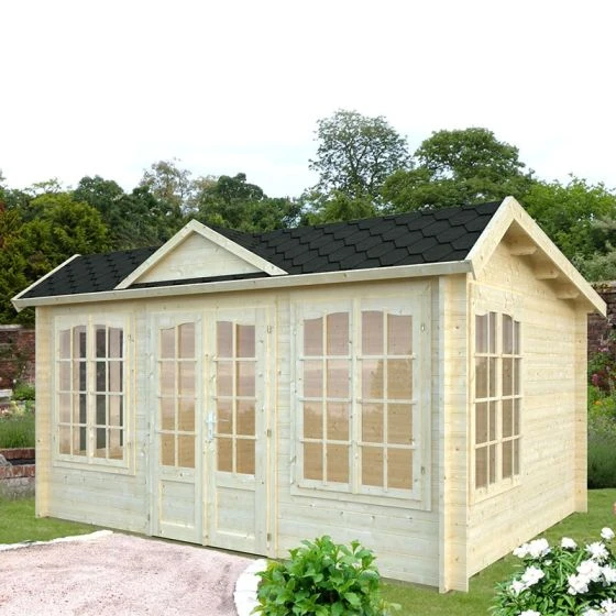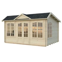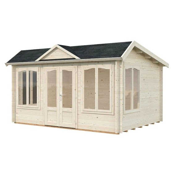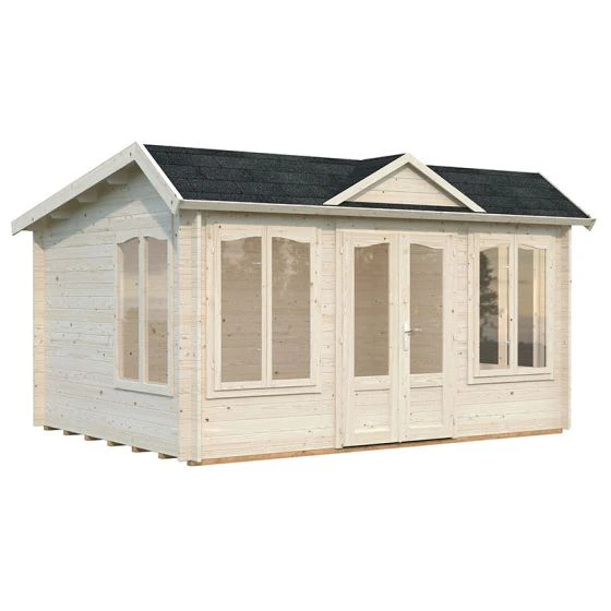 This log cabin/ summerhouse is manufactured from 34mm slow-grown Nordic spruce logs with a tongue and groove chalet-cut design, so is incredibly strong, exceptionally long lasting, and far easier to assemble than most log cabins. With its tight, interlocking build and added wind braces, this chalet-cut tongue and groove design also ensures unbeatable weatherproof protection.
