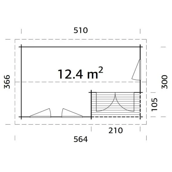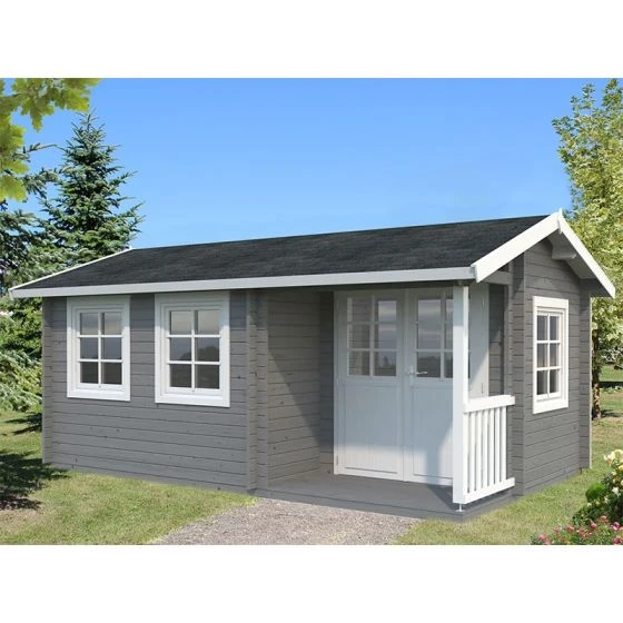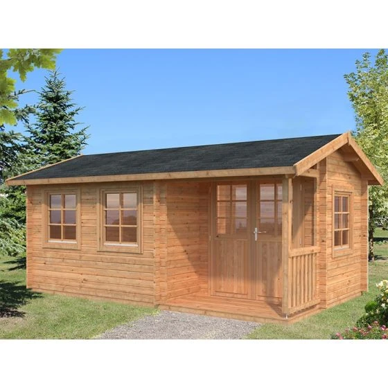 The Susanna log cabin is a spacious room with many windows and a fantastic covered porch. Its shape and size makes it perfect for a multitude of different functions, including a home office or garden gym.