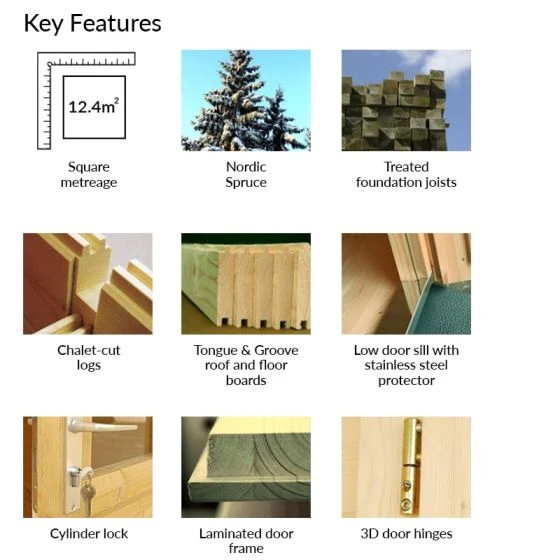 Like many similar log cabins, this Susanna is built from quality assured Nordic Spruce and has the ability to withstand everything the British weather throws at it. Many design features, included roof overhang and door seals and silicone provide a wind and rain free environment.