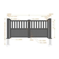 These aluminium double swing gates are available with a black or grey finish, and in a wide range of sizes. They all include a fixings kit, comprising of 4 heavy-duty wall-mounted hinges and 2 floor-mounted hinges.