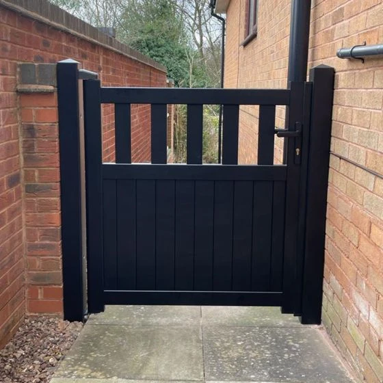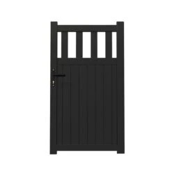 The gate’s elegant design is a modern twist on a traditional style. It includes a solid, vertical infill and flat top, ensuring additional security and partial privacy for a home and garden.