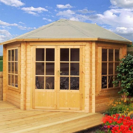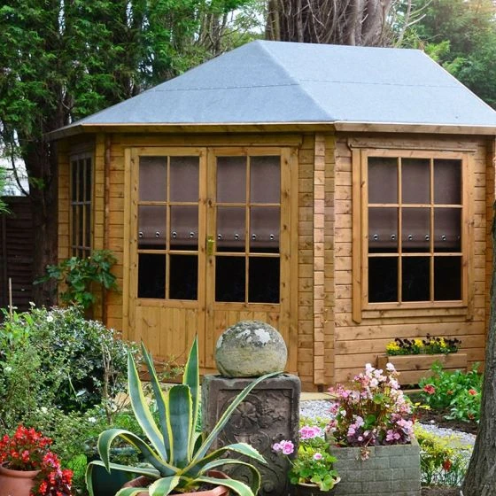 Expertly manufactured in the UK, from 28mm Northern European pine logs, this corner log cabin/ summerhouse is strong, durable and very well insulated. The floor is constructed from tough 12mm plywood, and supported by pressure-treated bearers to protect it from rot-causing ground moisture. The roof is made from 12mm plywood too. It features an eye-catching design and is fitted with a premium mineral-felt cover for complete weatherproof protection.